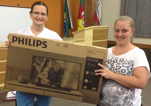 Rosane Simon entregou a TV Led para Carlise Ladwig Steiernagel, trabalhadora da Cotrijui de Augusto Pestana.