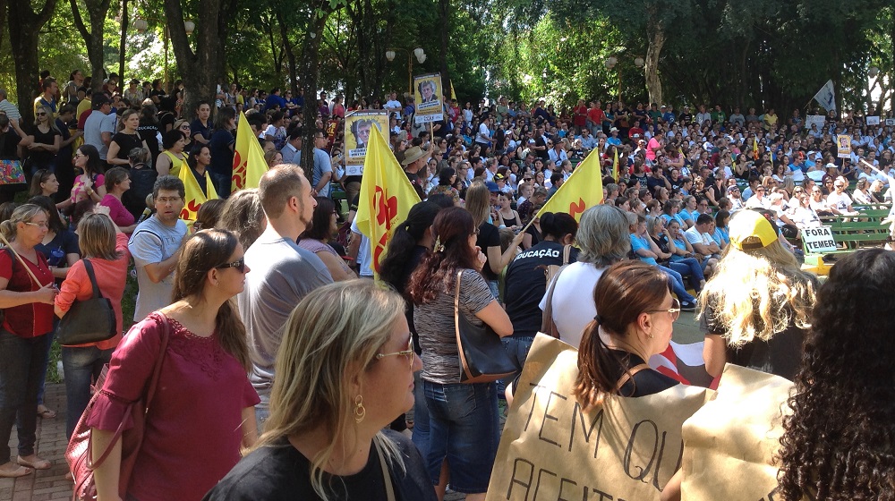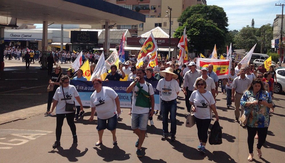 Após a chegada do grupo do Cpers-Sindicato, que estava em assembleia, uma caminhada foi realizada pelo centro da cidade. Portando cartazes e faixas, os manifestantes expressaram sua contrariedade com a reforma proposta pela PEC 287 e as falas exigiam dos deputados da bancada gaúcha, o voto contrário a proposta.