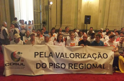 Em audiência no Palácio Piratini, na tarde desta quarta-feira (23/10), as centrais sindicais entregaram a pauta de reivindicações do Piso Regional, Desenvolvimento e Distribuição de Renda, ao governador do Estado Tarso Genro. Participaram mais de 500 pessoas ligadas à CTB e as demais centrais, e de vários sindicatos filiados à Fecosul.