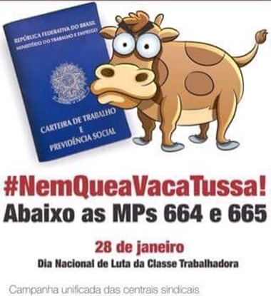 As Centrais Sindicais promovem nesta quarta-feira (28), o Dia Nacional de Lutas da Classe Trabalhadora. O ato unificado das Centrais Sindicais acontecerá em todo Brasil contra as MPs 664 (que trata de mudanças nas regras de pensão e auxílio doença) e 665 (que trata de mudanças nas regras do seguro-desemprego, abono e período de defeso do pescadores) 665 e pelo reajuste da tabela do Imposto de Renda. O ato usa a hastag #NemQueAVacaTussa como título, em referencia a fala da Presidenta Dilma durante a campanha eleitoral, de que não reduziria direitos trabalhistas “nem que a vaca tussa”.
