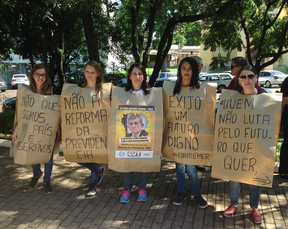 Após a chegada do grupo do Cpers-Sindicato, que estava em assembleia, uma caminhada foi realizada pelo centro da cidade. Portando cartazes e faixas, os manifestantes expressaram sua contrariedade com a reforma proposta pela PEC 287 e as falas exigiam dos deputados da bancada gaúcha, o voto contrário a proposta.